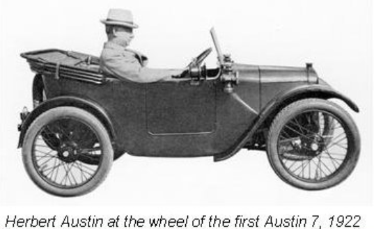 In 1922, came the 7 h.p. infant prodigy. It was received with much laughter at first and few took it seriously. Not so Sir Herbert Austin (Knighted in 1917). He had designed it entirely on his own and despite all criticism, he knew it was a winner.